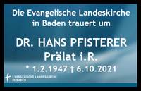 Karlsruhe, (16.10.2021). Am 6. Oktober ist Dr. Hans Pfisterer, Prälat i.R., gestorben.